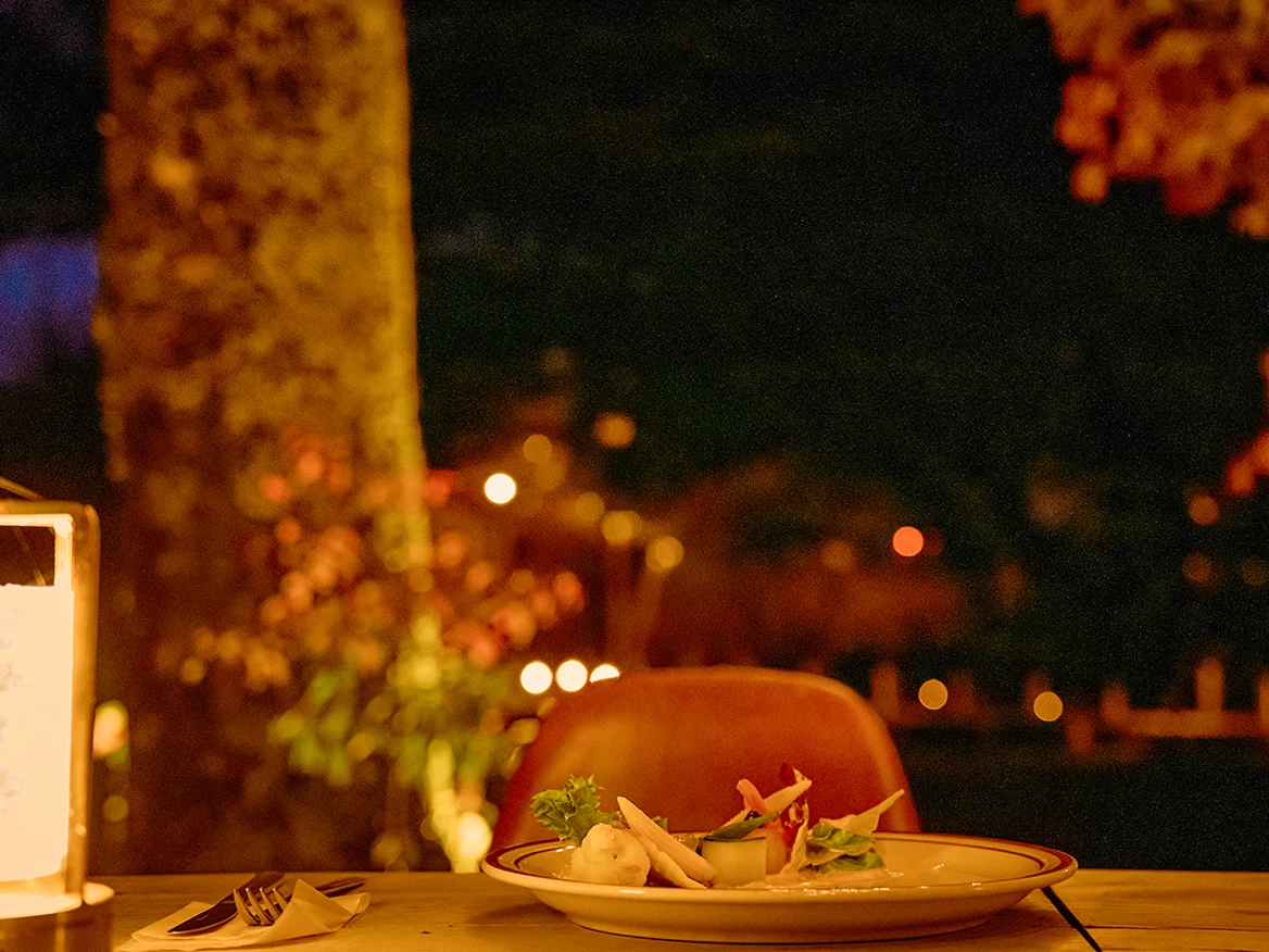 宵闇が森を包み込むと、無数のランタンの温かな灯りがタブの大樹を幻想的に照らし出します。夜風の心地よさを肌で感じながら、メインディッシュの肉料理とワインを堪能。時計を外し、大切な人と心ゆくまで語り合う、洗練された大人の夜をお過ごしください。