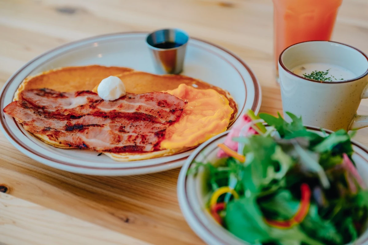 朝は併設のベーカリーレストランで、焼きたてのパンケーキやベーコン&エッグのアメリカンブレックファストを。爽やかな朝日の中で優雅な朝食をどうぞ。(土日祝・繁忙期限定)