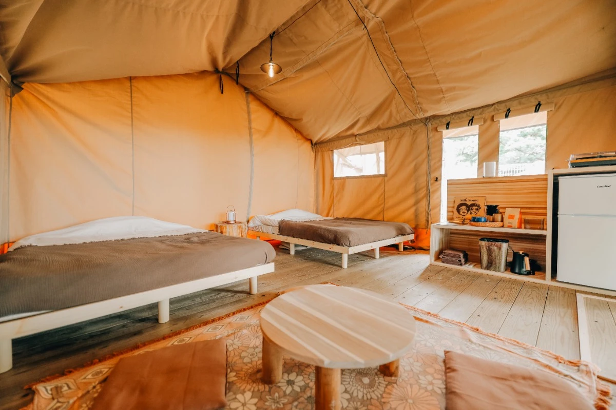 まるでホテルのような快適さを備えたロッジ型テント。室内にはダブルベッド、エアコン、冷蔵庫を完備しており、季節を問わず快適にお過ごしいただけます。