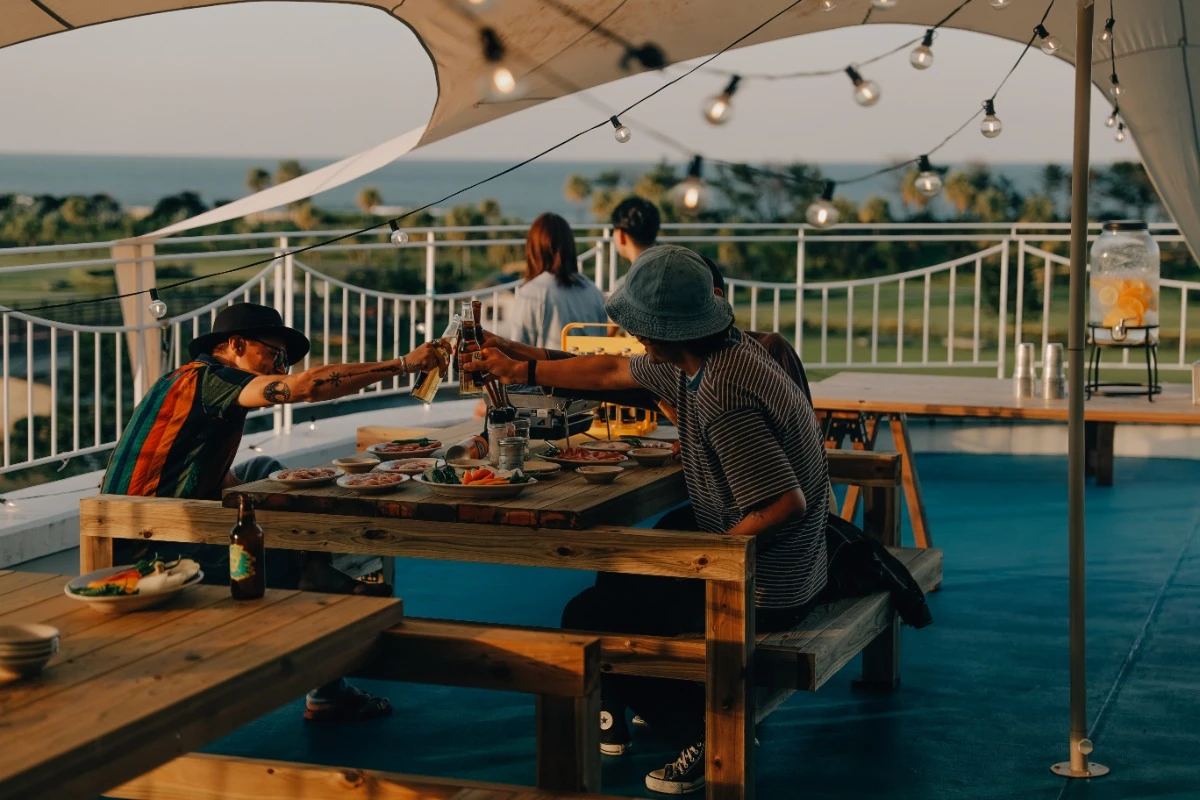 - 夕暮れ時は「BBQ & BEER TERRACE」へ移動。オレンジ色に染まる空と海を眺めながら、宮崎の食材を豪快にグリル。心地よい風と共に味わうビールは格別です。